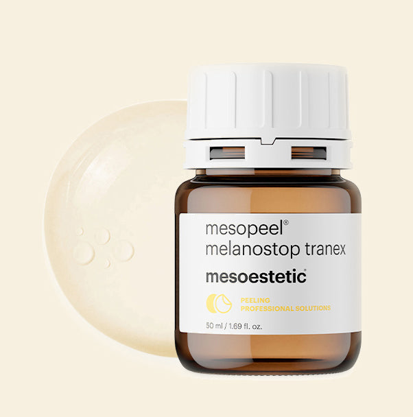 Maak kennis met dé anti-pigment peeling van Mesopeel. De Melanostop Tranex-peeling wordt ingezet tegen bestaande pigmentvlekken (oppervlakkige en epidermale hyperpigmentaties, milde zonnevlekken, sproeten) en reguleert de melanineproductie, zodat nieuwe pigmentvlekken minder snel optreden. De peeling is samengesteld met vier typen krachtige zuren tegen pigmentvlekken: tranexaminezuur, azelaïnezuur, fytinezuur en kojinezuur. Na een kuur met Mesopeel Melanostop Tranex is je teint gelijkmatiger en helderder.